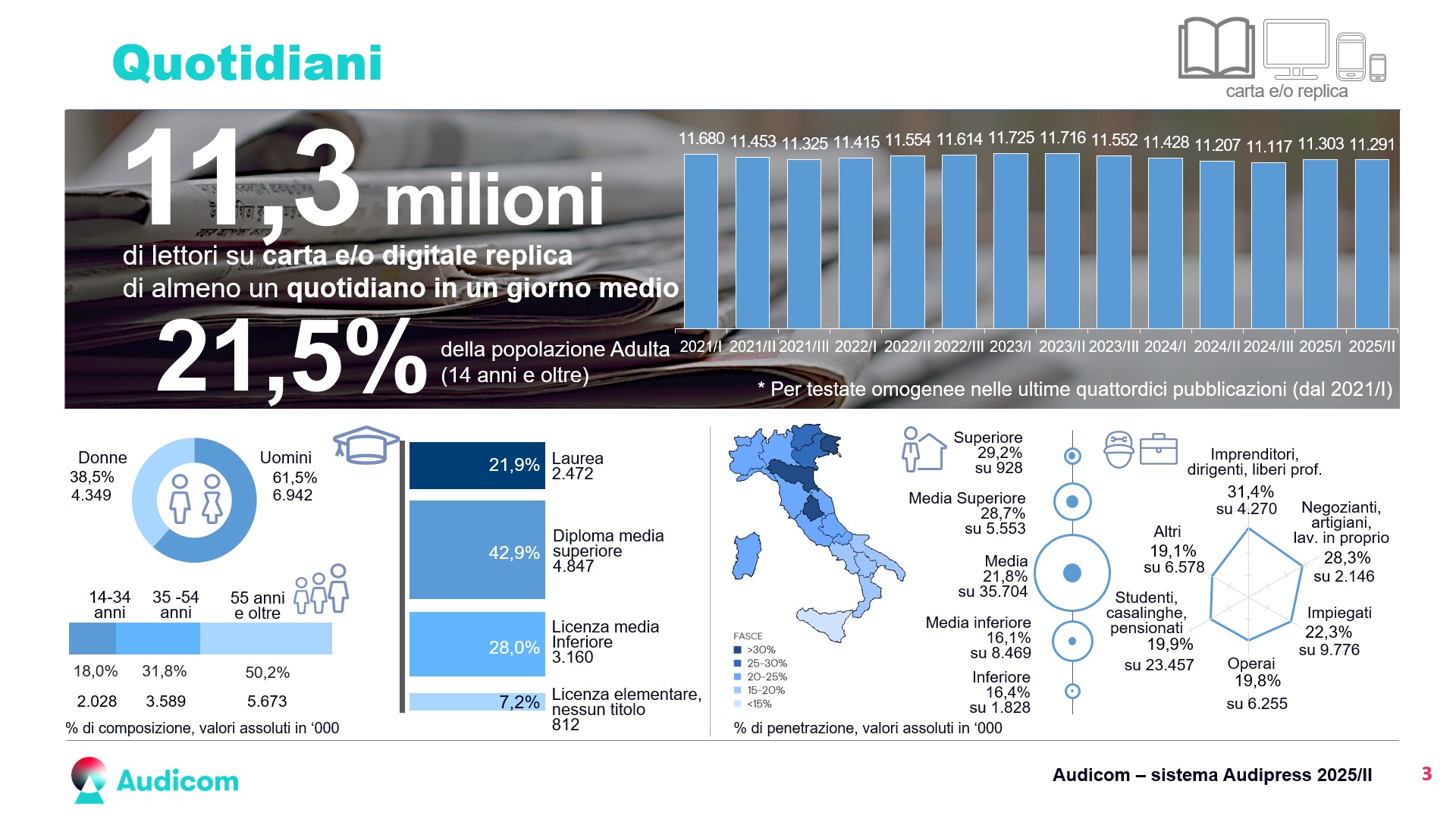 Scarica il comunicato stampa Audicom Sistema Audipress 2025/II (pdf) Scarica i dati di sintesi Audicom Sistema Audipress 2025/II (excel) Scarica i grafici di scenario Audicom Sistema Audipress 2025/II (pdf)